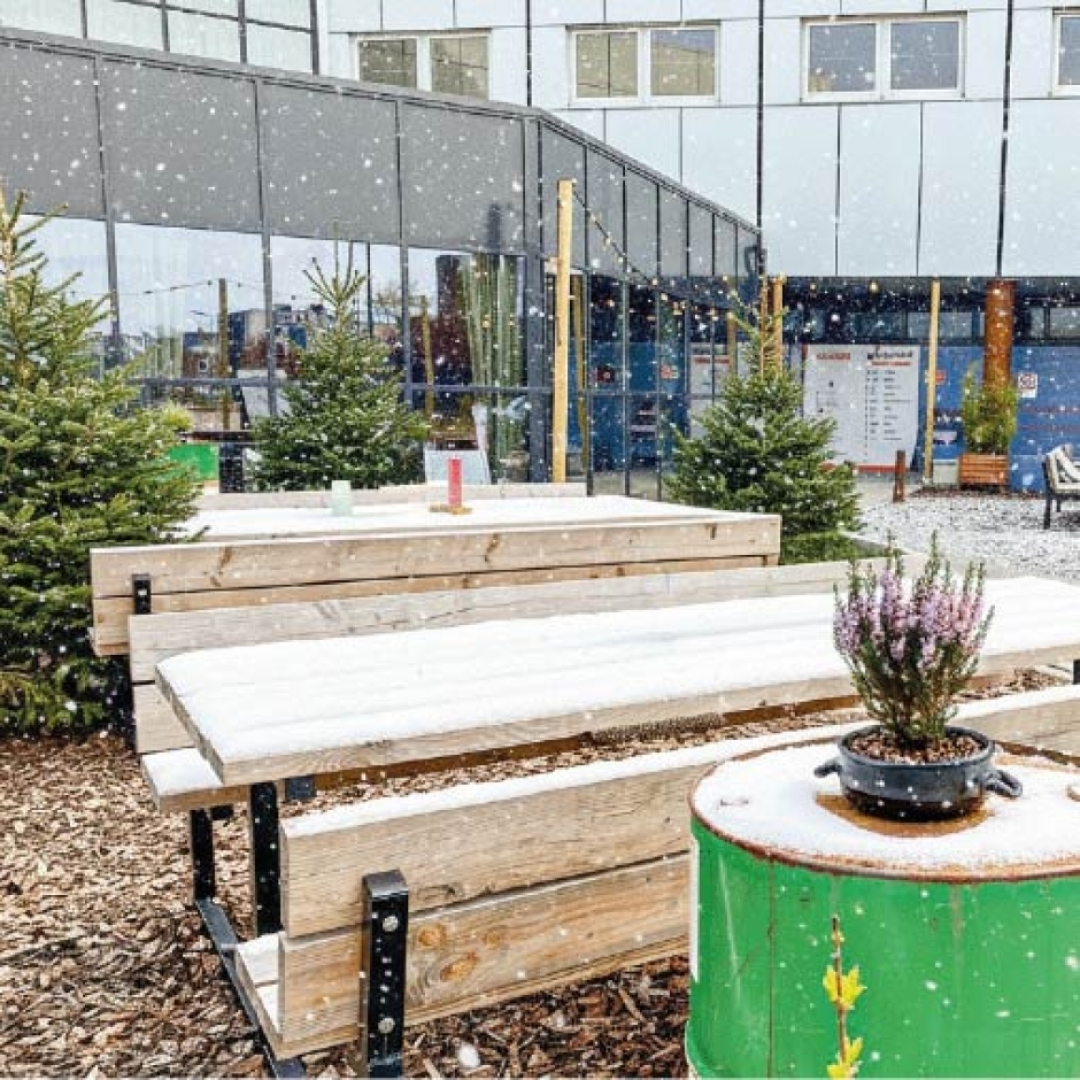 Waar de kerstbomenverkoop voorheen in Polanen plaatsvond, gebeurt het dit jaar vanaf het winterse terras van de HALL.
